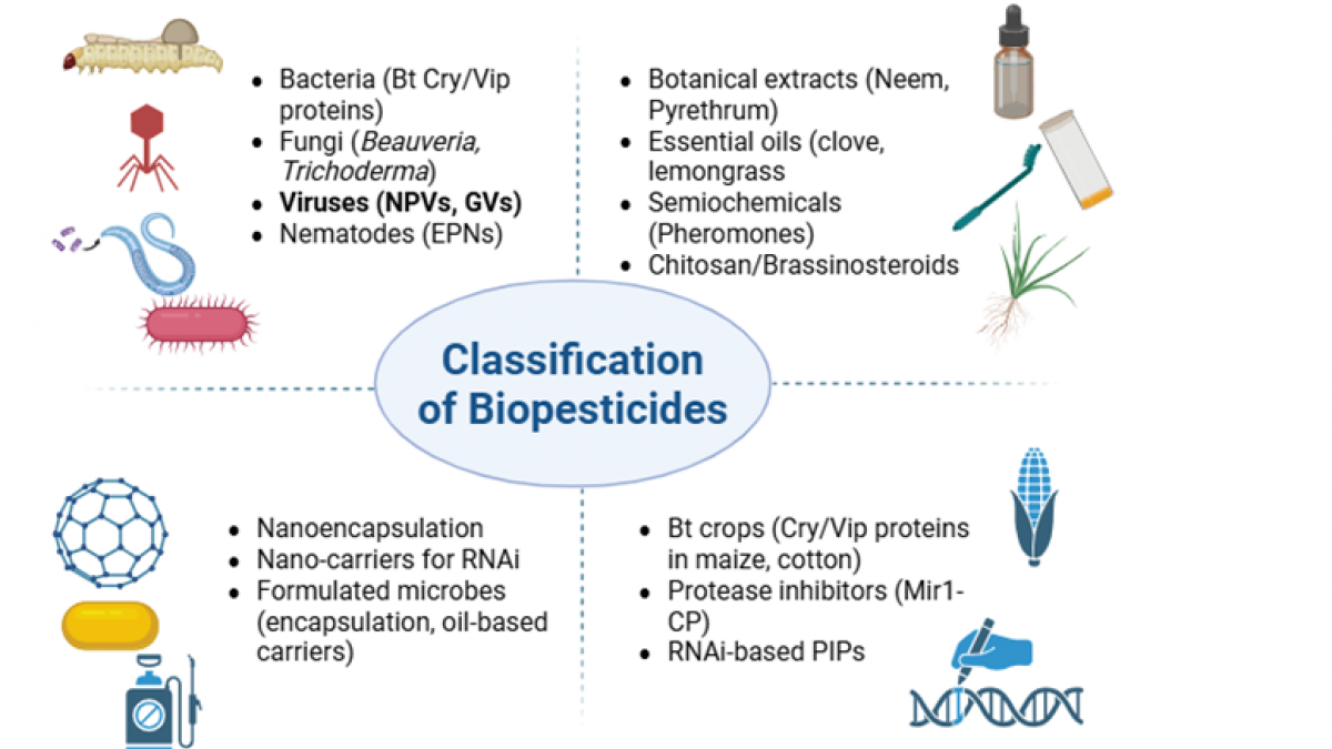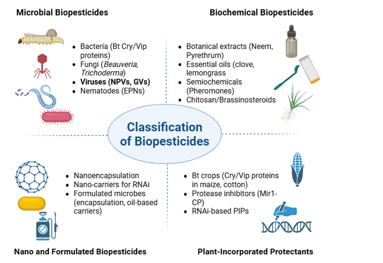 The overreliance on chemical pesticides has led to the development of resistance, ecological disruption, and health issues, necessitating the pursuit of safer alternatives. Biopesticides, originating from natural organisms or their metabolites, offer precise pest management with diminished environmental consequences. They are categorized into microbial biopesticides, biochemical biopesticides, and plant-incorporated protectants (PIPs) created via genetic engineering. Notable successes include Bacillus thuringiensis in maize, Trichoderma spp. in horticultural crops, and nucleopolyhedroviruses in the management of lepidopteran pests. Innovations in nanoformulations and RNA interference (RNAi) technologies are addressing problems of insufficient stability, rapid degradation, and variable field efficacy. Biopesticides provide additional advantages such as compatibility with integrated pest management systems and enhancement of plant growth; however, their adoption is frequently constrained by regulatory obstacles, limited shelf life, and insufficient farmer awareness. Due to continuous advancements in biotechnology and formulation science, biopesticides are set to become essential components of sustainable, climate-resilient crop protection strategies.
